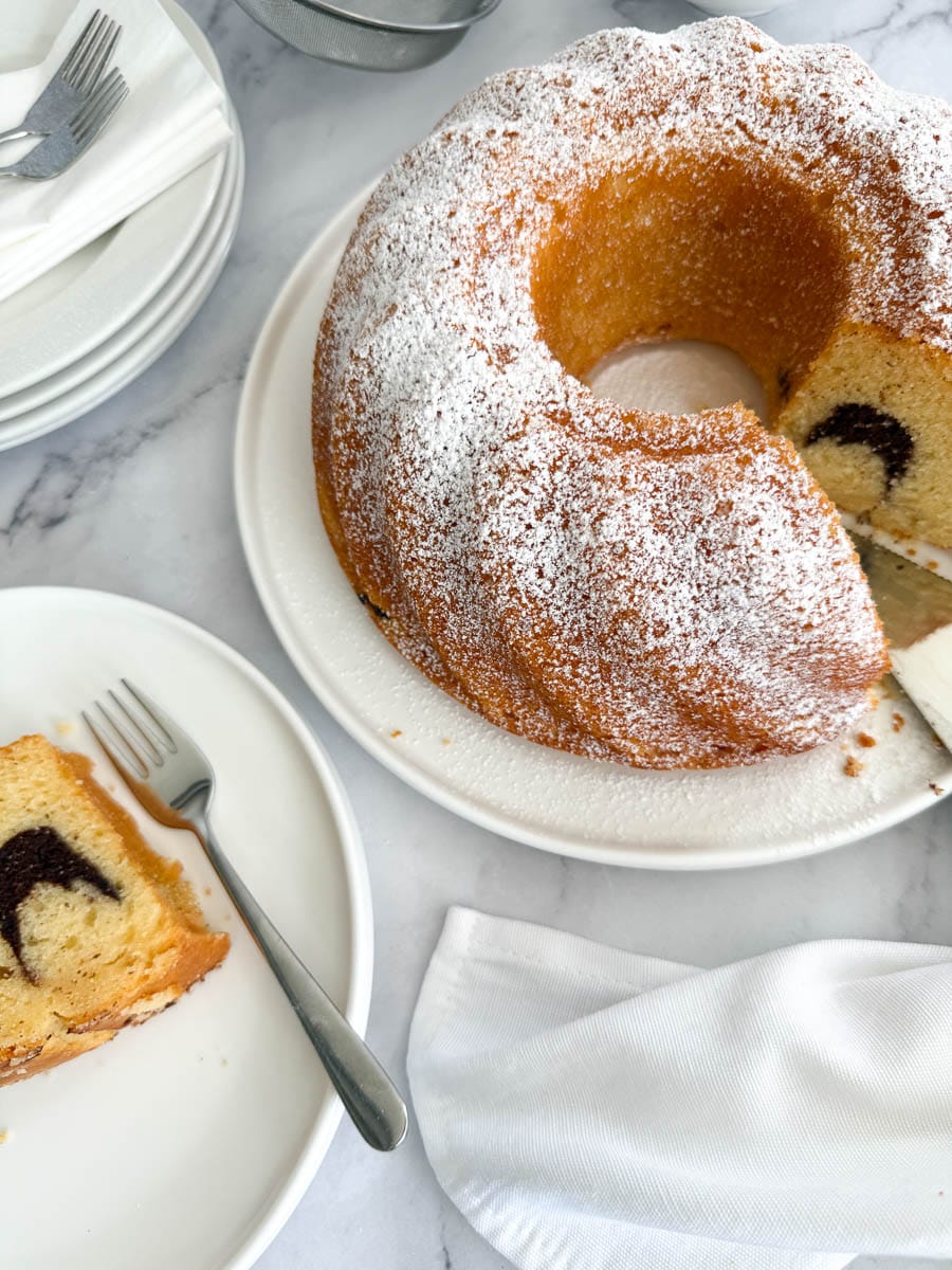 Cocoa powder: I mix three teaspoons of cocoa with 1-2 tablespoons of warm water to form a smooth paste, then fold in about 3-4 tablespoons of the batter. You can add more batter to the cocoa mixture if you want a more pronounced marbled effect and less vanilla. I prefer the cake to be mostly vanilla with just a subtle swirl of cocoa.